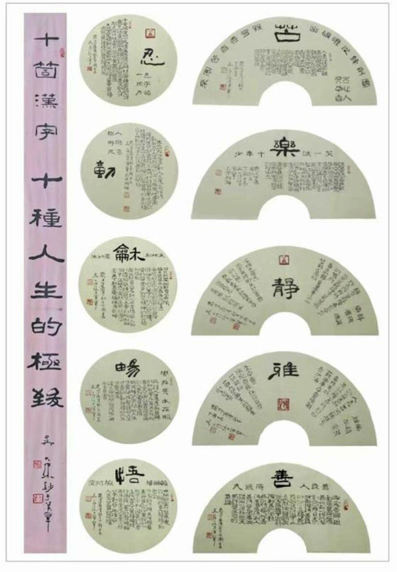 吴大来先生擅长以行写隶,线条爽健畅快,方圆兼备,由筋见骨,由形见神。运笔极其灵活,顿、挫、折、转、翻、搅、腾、挪,质朴不雕,流动飘逸。布局错落有致,呼应顾盼,气韵连贯,浑然天成