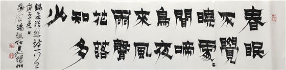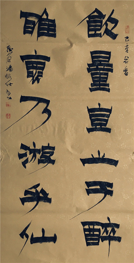 喧闹的城市,緊忙的乡村,穿梭的人群,高速发展的社会……有谁能耐得住寂寞而神游在中国书法艺术的长河中?“场州八怪"之首金农“漆书”传人汤禄仕(墨原)便是其中一位,他富有激情,热爱生活在书法艺术上颇有成就,诸体皆擅,功力非凡,所创作作品雅俗共赏,自出一家风范,既恪守传统,又标新立异,所写“漆书"既传承了“扬州八怪"之首金农之遗韵,同时又独具自己的风格,实乃难能可贵,观其“漆书”乃是力量与心灵造化的完美结合,如雄峰巍立,又如长河奔流,宽厚宏博,闳约深美,数百年来在扬州这块土地上,能呈现出这种雄浑博大,豪迈壮丽的书法艺术,实在令人欣慰!抑或是受场州这块钟灵毓秀宝地灵气的熏染。墨原所传承并创新的“漆书”艺术是场州文化品牌,更是中国的品牌文化,已被有关权威门列为“中国品牌文化产”。