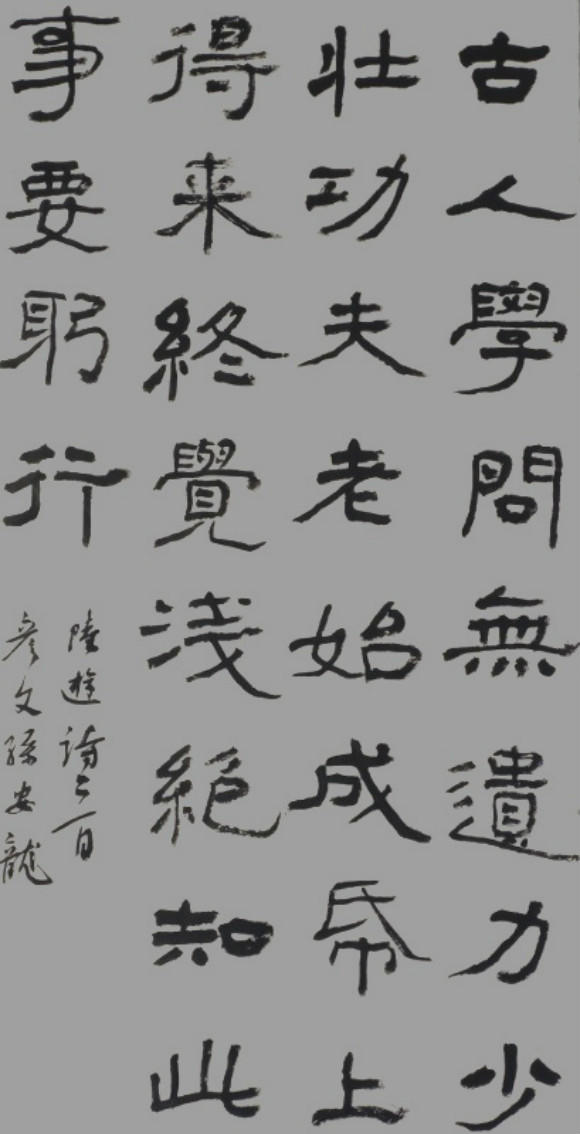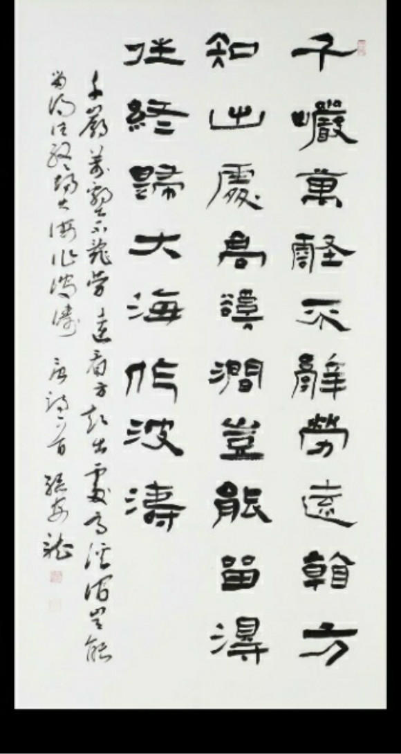 在欣赏孙安龙的书法作品时,能看到书法家的成熟与端稳,也颇能感受到他的昂扬与正气。看笔锋的刚劲与利落,宛如静默的山。看线条的流畅与柔美,又如一条流淌的河。一点一横,至简至朴,一撇一捺,至纯至真。有绵里藏针之劲道,也有肉里剔骨之纯粹。风范与意态相得益彰,线条与韵致协调统一。