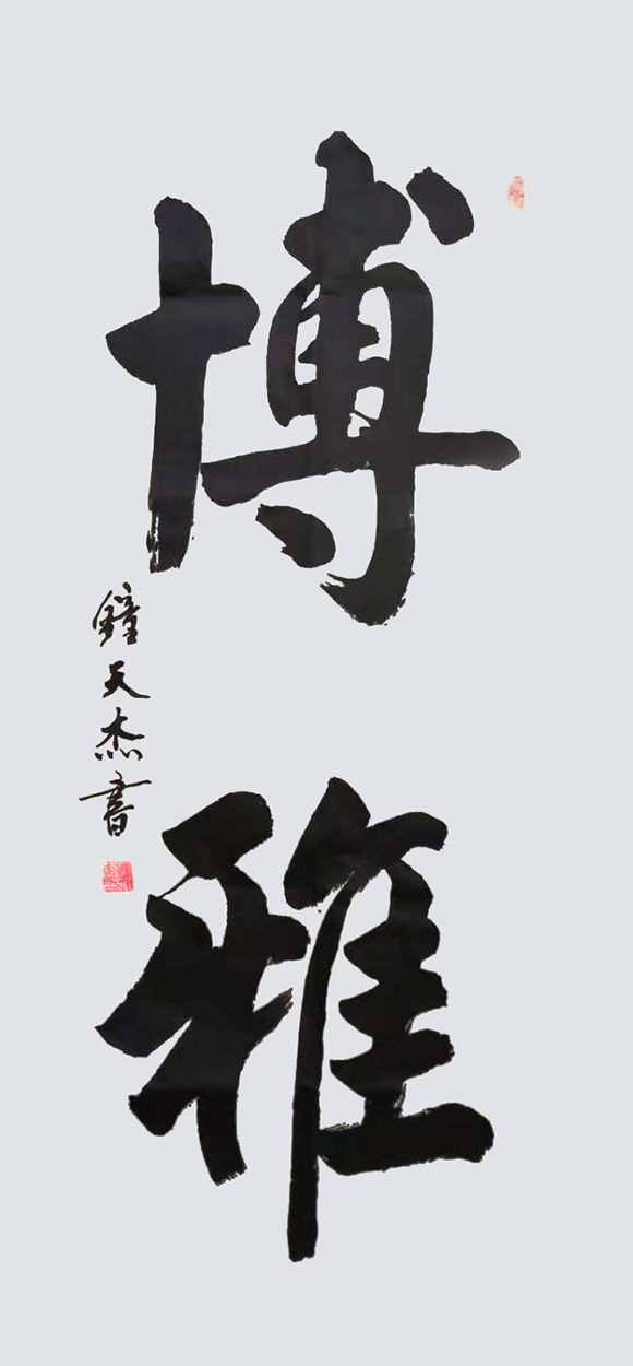钟天杰,一九五一年生于陕西延安, 一九六九年参加工作,原任于延安市商业局局长,延安市食品总公司总经理,党委书记。年轻时酷爱书法,就读中国书法函大学习三年,退休后,苦临古人习帖,结业于国开大学书法高研班、中国榜书委员会书法高研班,受教育于中书协副主席言恭达、申万胜、刘洪彪、张继、卢中南、原陝西省书法家协会主席雷珍民老师等先生,其作品在全国和当地大展中多次获奖,深受业内人士和爱好者赞誉和好评。